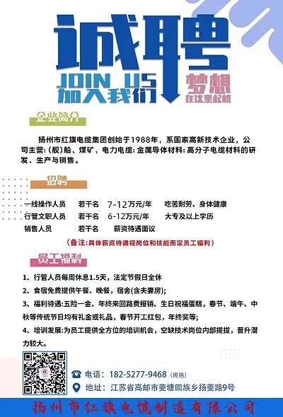 | 條件要求: | 具體要求:1)大專及以上學歷,有營銷專業(yè)的相關(guān)知識,及愿意在電纜行業(yè)發(fā)展的有識之士;2)形象氣質(zhì)良好,身體健康、具有較強的市場開拓能力,能吃苦耐勞,責任心強,較強的學習力和團隊合作精神。 |