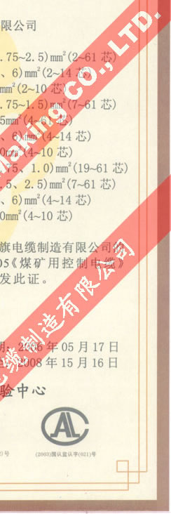 國家采煤機械質(zhì)量監(jiān)督檢驗中心檢驗合格證--煤礦用阻燃電纜(MKVV22-450/750)