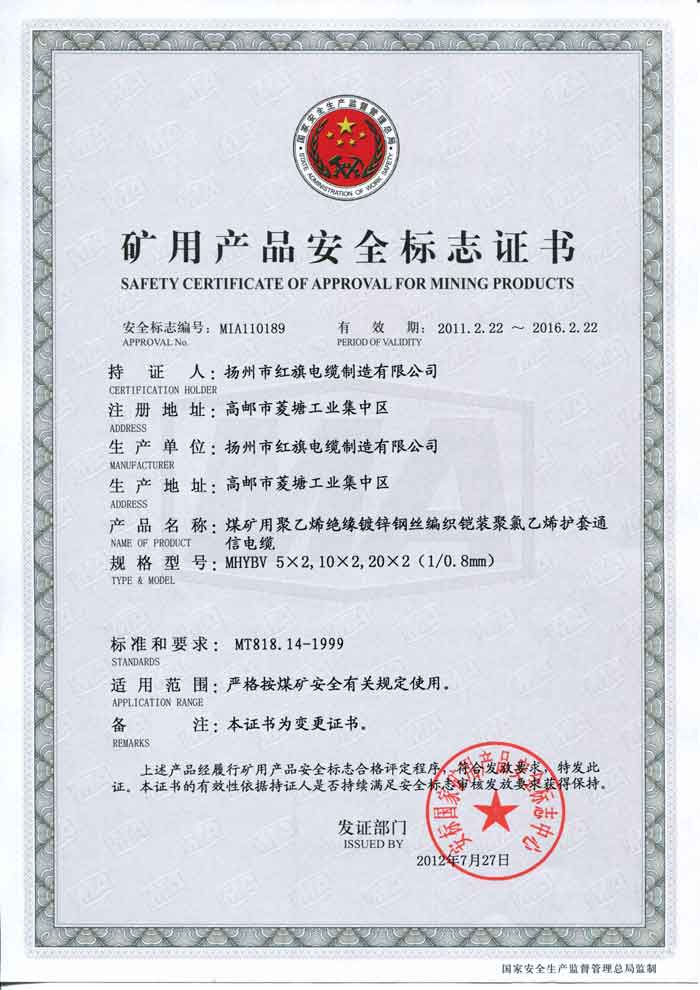 煤礦礦用產(chǎn)品安全標志證書-MHYBV0.8