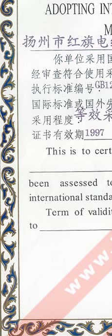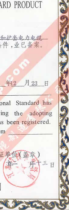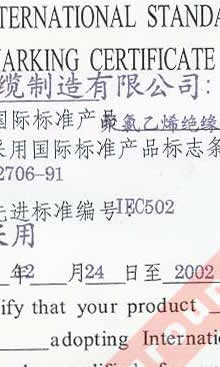 國家技術(shù)監(jiān)督局采用國際標準證書(聚氯乙烯絕緣和護套電力電纜)