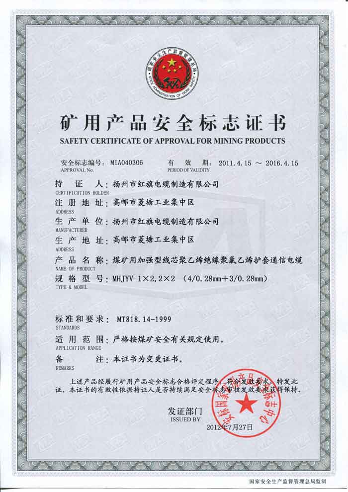 煤礦礦用產(chǎn)品安全標(biāo)志證書(shū)-MHJYV