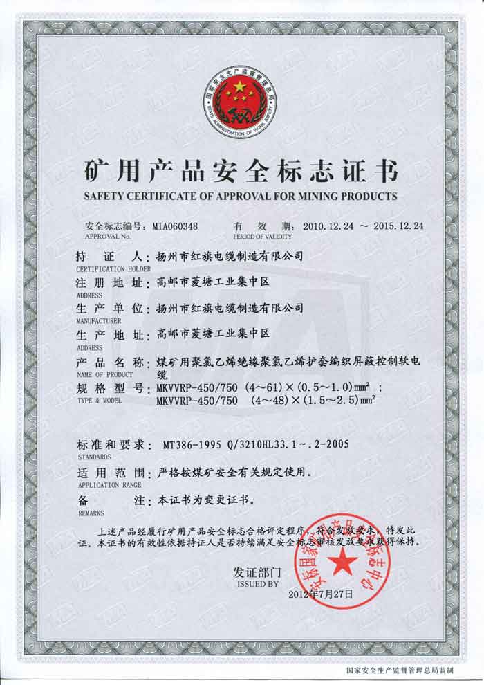 煤礦礦用產(chǎn)品安全標志證書-MKVVRP