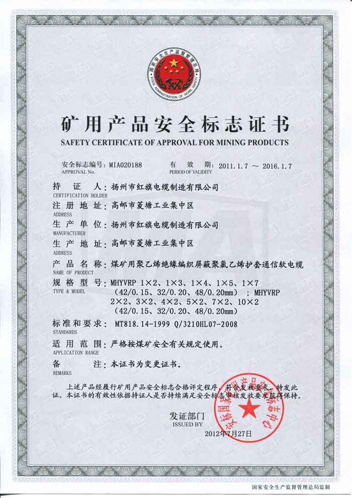 煤礦礦用產(chǎn)品安全標(biāo)志證書-MHYVRP